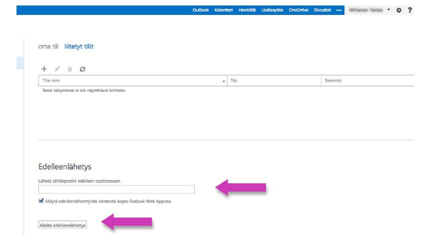 4. Kohtaan Edelleenlähetys kirjoita se sähköpostiosoitteesi, jonne