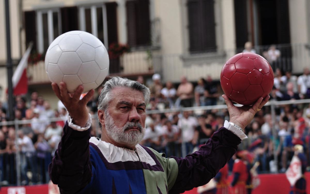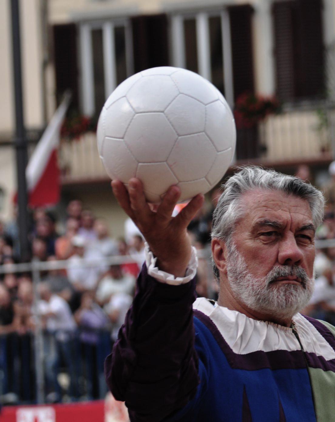 The game starts when the Pallaio throws the ball towards the center line, followed by a small cannon firing; the shot announces the beginning of the contest.