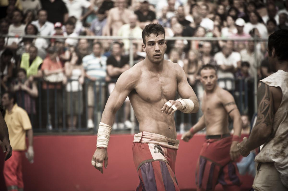 The game starts when the "Pallaio" kicks the ball in the field and the shot of "Colubrina" a little cannon, to salutare il gioco. At this time every player tries to catch the ball and put it in the opposite net to score a "Caccia" or point. At first the ball rests on field because the players fight in a wild boxing match against each other, the way is to knock out or pin down as many players possible, once there are enough incapacitated players, the other teammates come and swoop up the ball and head to the goal.