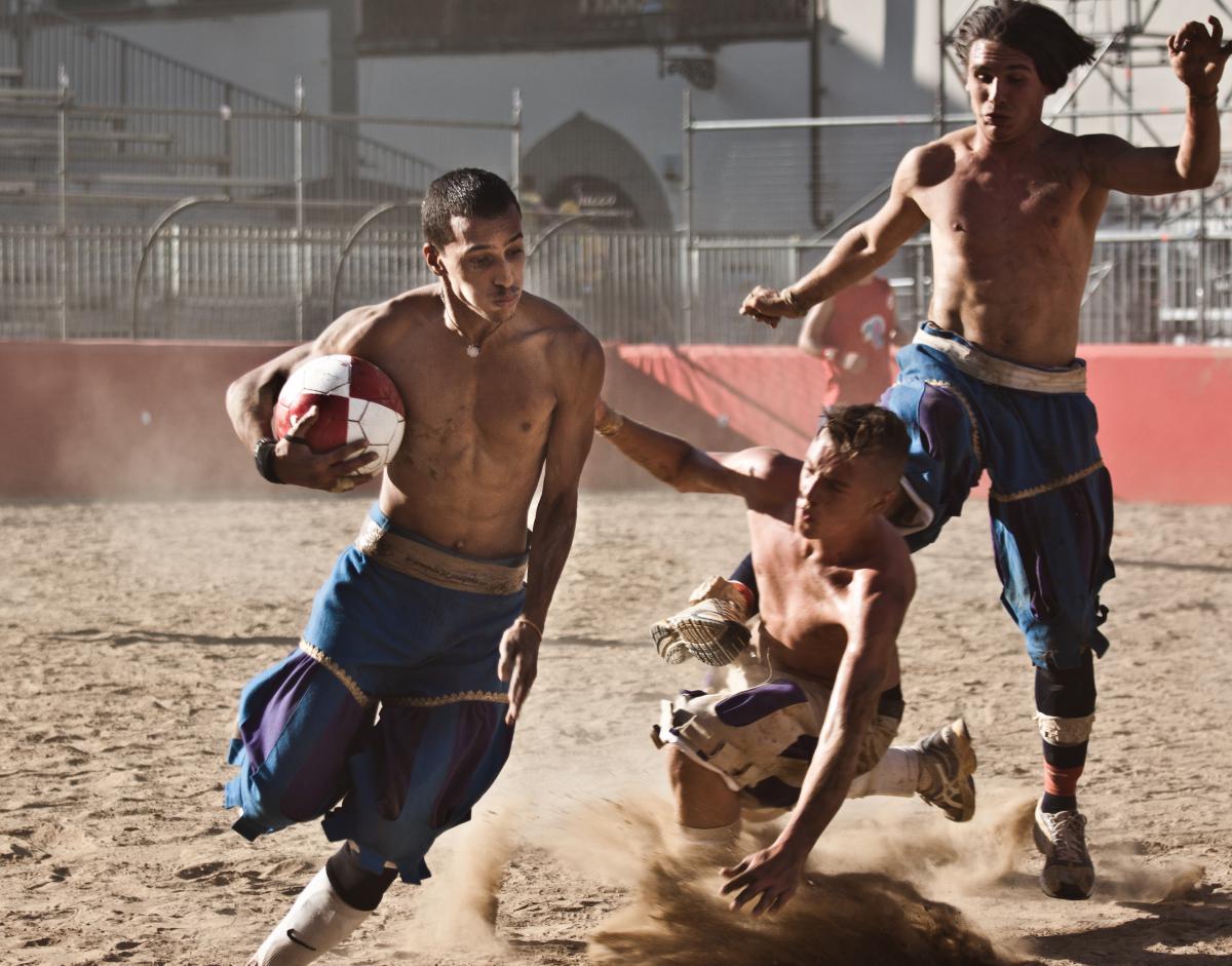 Matches last 50 minutes and are played on a field covered in sand, twice as long as it is wide. A white line divides the field into two identical squares, and a goal net runs the width of each end. Each team has 27 players with no substitutions. The teams are made up of four Datori indietro (goalkeepers), 3 Datori innanzi (fullbacks), 5 Sconciatori (halfbacks), 15 Innanzi o Corridori (forwards). The Captain and Standard Bearer's tent sits at the center of the goal net. They do not actively participate in the game, but can organize their teams and sometimes act as referees, mainly to calm down their players or to stop fights.